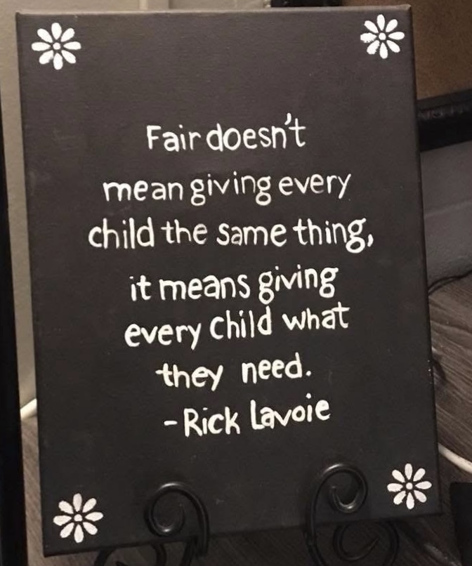 This shift is not just about instructional strategies; it’s about empathy, psychological safety, and fostering a sense of belonging. When students understand that everyone’s needs are different, classroom communities become stronger, safer, and more collaborative. When I became an assistant principal many years ago, my role was focused on student advocacy. I was the 504 coordinator, and the RTI coordinator, which led me to learn more about equitable access for all students. A teacher gave me this wonderful gift–a canvas with a quote that became a mantra.